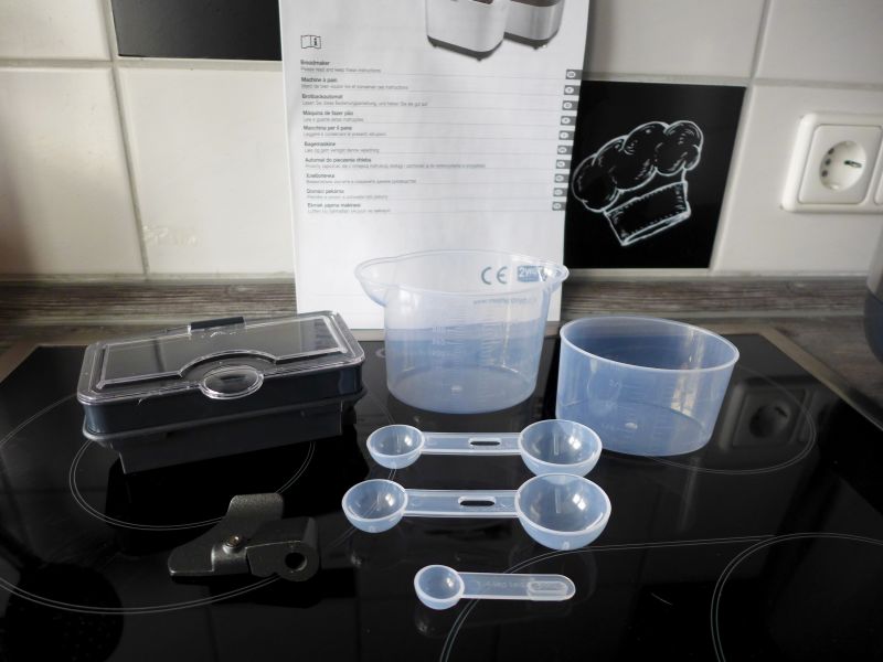 Mit dabei einiges an Zubehör und eine umfangreiche Bedienungsanleitung mit vielen Tipps und Rezepten. Erst dachte ich, es wäre ein Fehler, dass Messbecher und Löffel in zweifacher Ausführung vorhanden sind, aber das hat einen einfachen Grund.