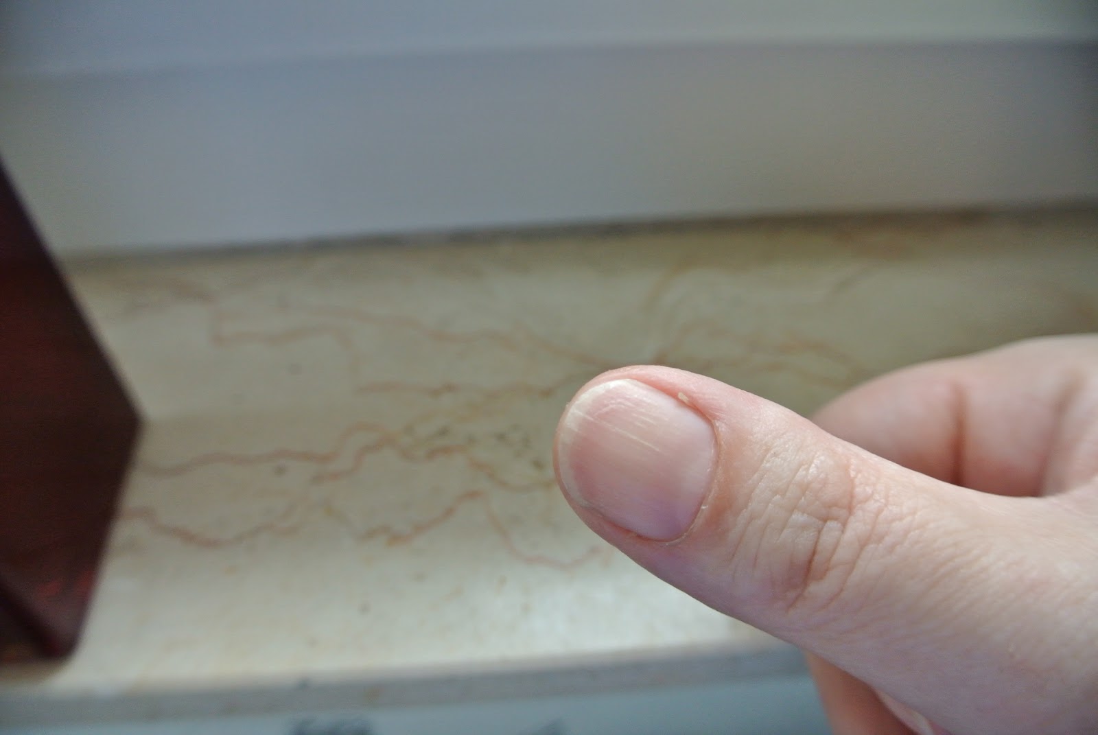 Hier am Daumen ist es am schlimmsten, er reißt auch ständig ein und hier sind die Rillen am schlimmsten.