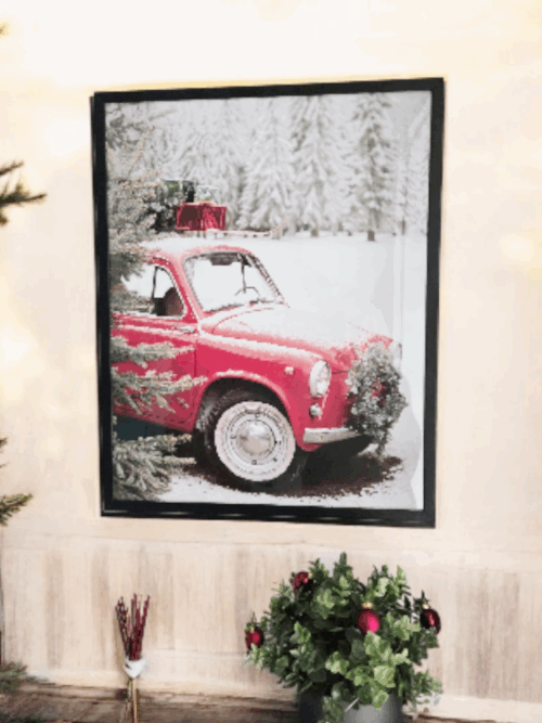 Für den Flur hat sie sich für einen Farbtupfer entschieden. Dieser ist sehr klein und schlicht. Das Winterbild mit dem roten Auto ist in natura so wunderschön. Und Rot steht für mich immer noch ganz klar für Weihnachten und Liebe. Man kommt herein und der Blick fällt gleich auf dieses tolle Poster.